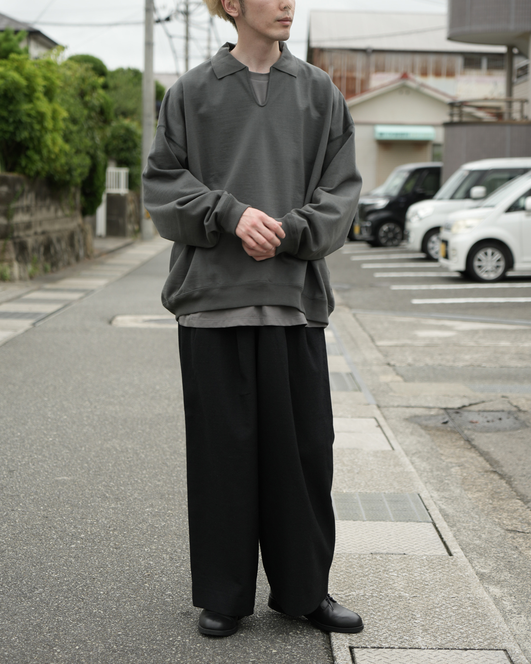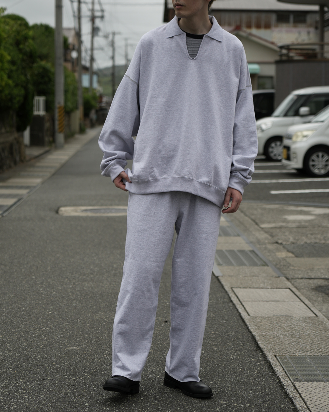 そして特筆すべきは、スウェットでありながら感じられる上品な「光沢感」 。これがカジュアルなアイテムであるスウェットを、ぐっと大人びた洗練された表情へと昇華させています。