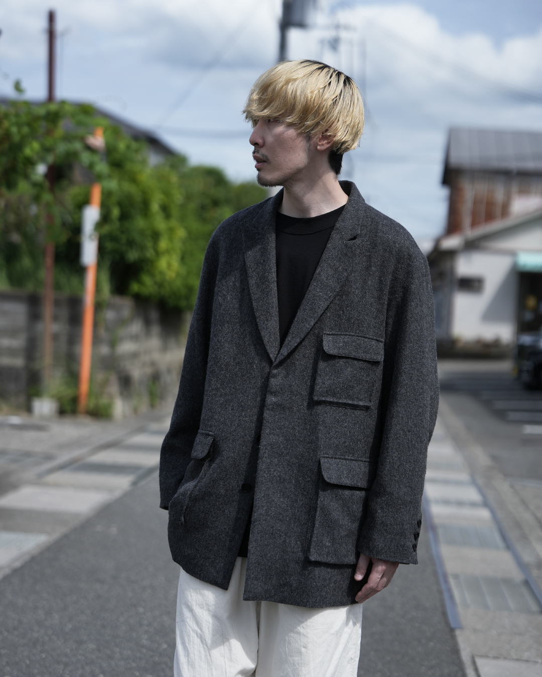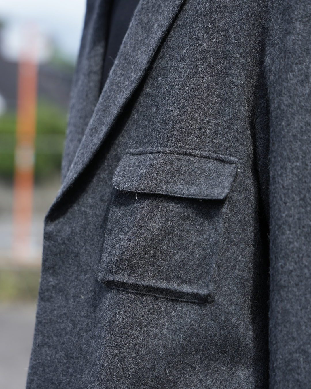 サイドに加え、左胸にも実用的なマチ付きのフラップポケットを配置しています。ジャケットとしては珍しいワークテイストな要素が加わり、ユニークな表情を見せてくれます。