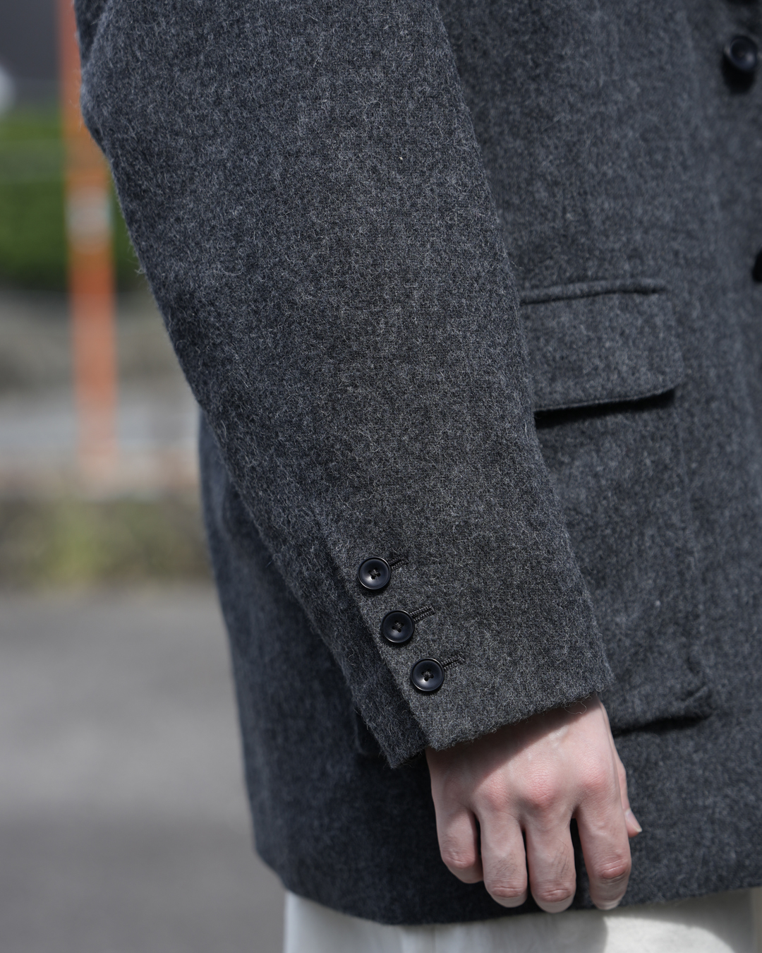 ピークドラペルというシャープな襟のデザインが、全体のリラックス感の中に落ち着いた印象を加えてくれます。