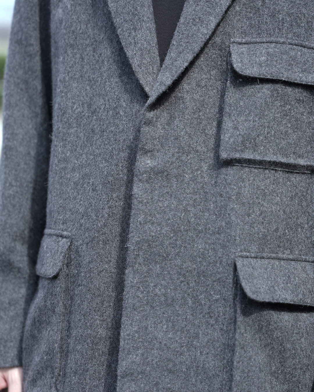 この『LONG JACKET C』には、リサイクルウールによる軽さと、メランジカラーが特徴の起毛平織り生地が使われています。