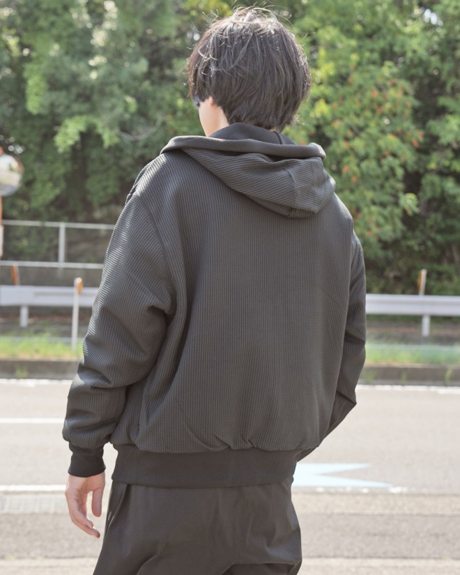 そして特筆すべきは、スウェットでありながら感じられる上品な「光沢感」 。これがカジュアルなアイテムであるスウェットを、ぐっと大人びた洗練された表情へと昇華させています。