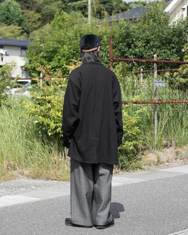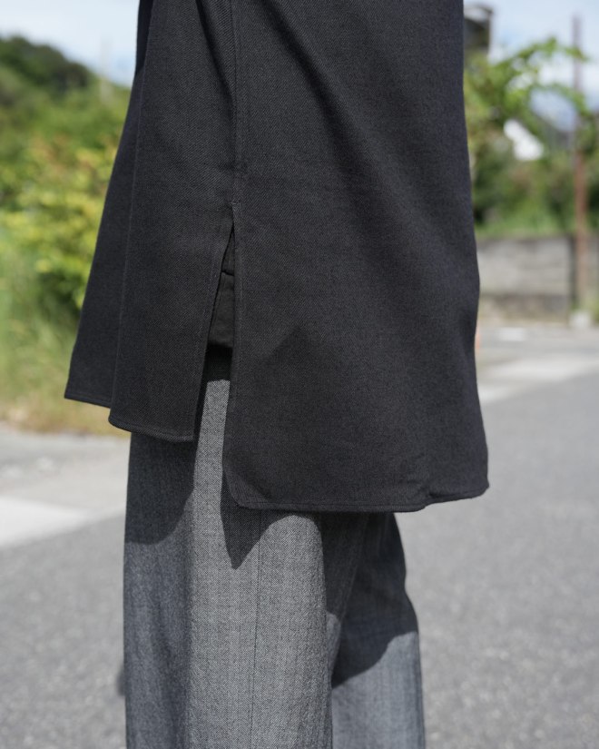大きく落ちるドロップショルダー、たっぷりと取られた身幅と袖幅が、全体に丸みを帯びた柔らかなシルエットを形成 。そして、後ろ身頃を少し長めに設定し、裾と袖口のリブのテンションを緩やかにすることで、裾に絶妙な“たまり”が生まれ、だらしなく見えない美しいドレープを演出しているのです 。