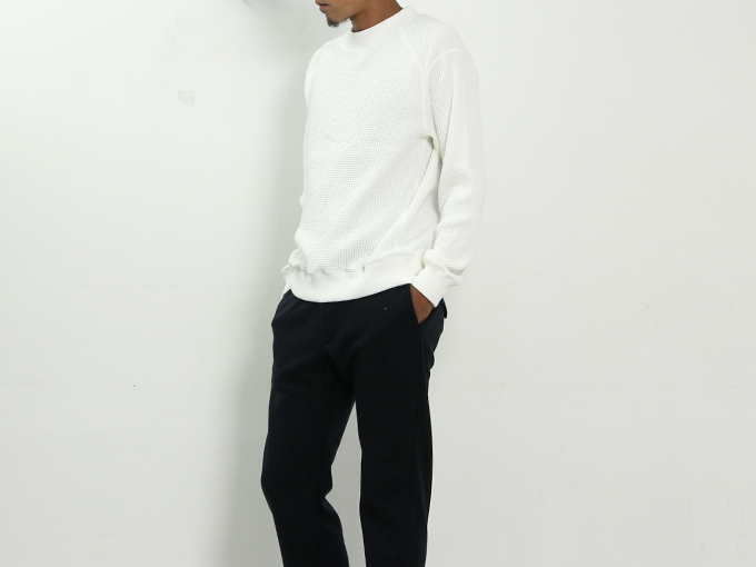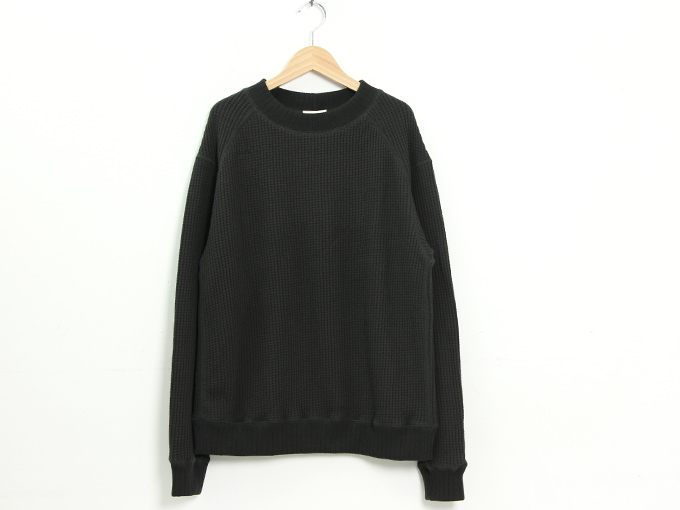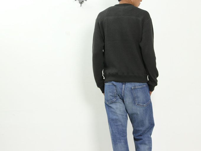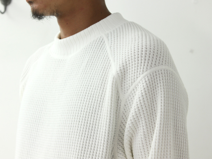 ワッフル編地の他にも袖口と裾、少し立ち上がったネックには畝のあるリブを使用し