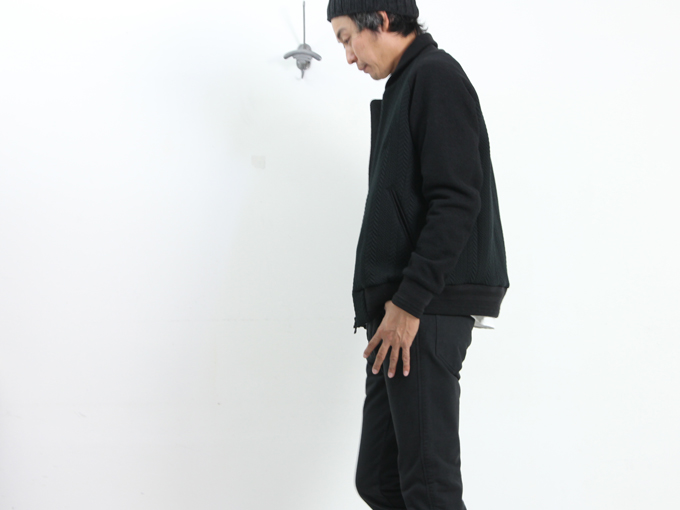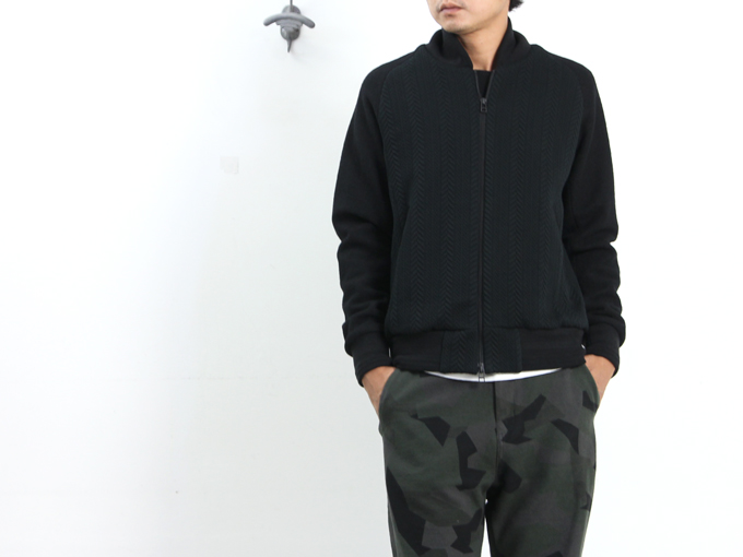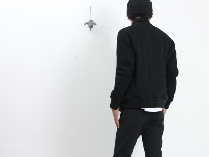 アームと切り替えられた身頃には凹凸によってケーブル状の模様を表現。