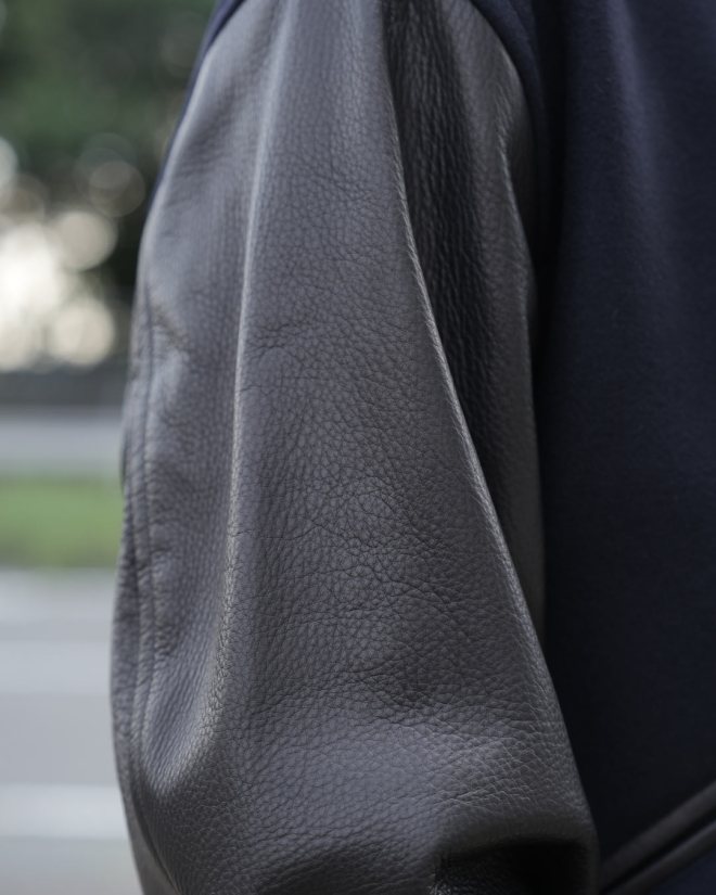 ボディのメルトンとの素材のコントラストが、このジャケットの持つクラシックな骨格と現代的な洗練さを際立たせています。